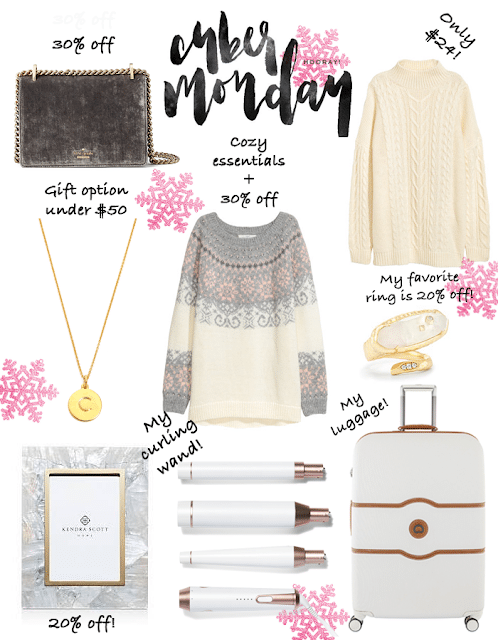Velvet Shoulder Bag // Fair Isle Sweater // Cable Knit Sweater // Kendra Scott Cocktail Ring // Monogram Necklace // Pearl Frame // Curling Wand // Luggage
