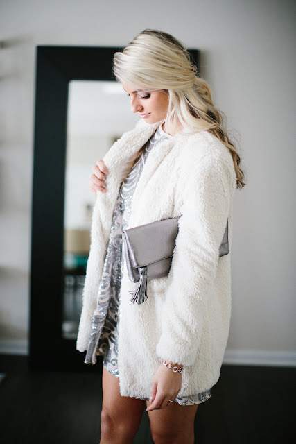 Show Me Your Mumu Gomez Dress // BB Dakota Jacket (tan color here) // Sole Society Heels (dupe for Valentino, also comes in black) // Vera Bradley Clutch (on sale!) // similar Nadri Earrings // Similar Bracelet