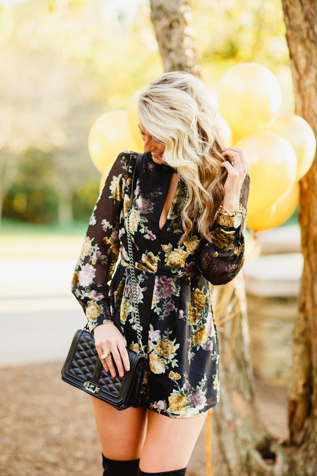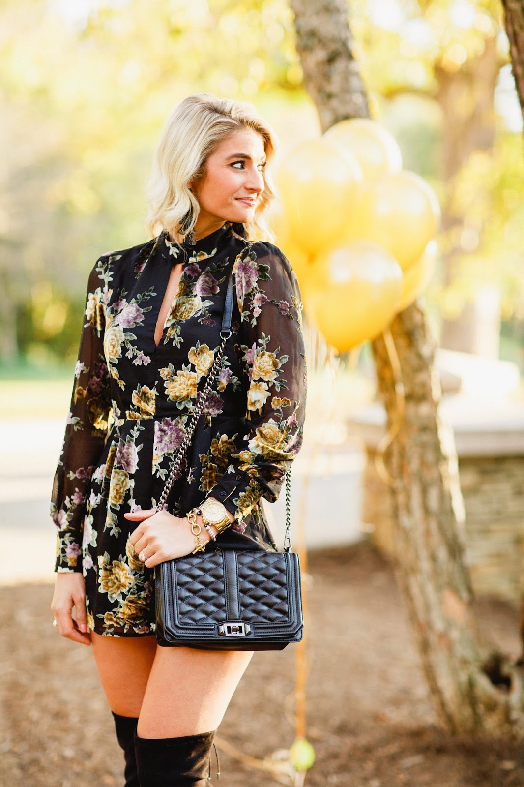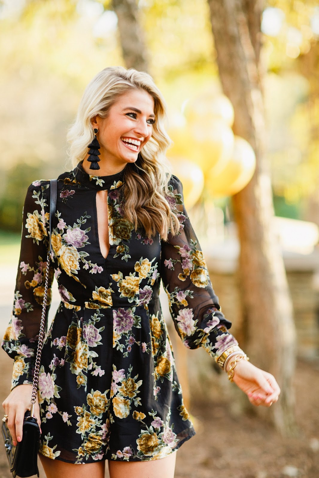 Floral Romper // OTK Boots // Crossbody bag // Tassel Earrings // David Yurman Bangle // Link Bracelet // Watch