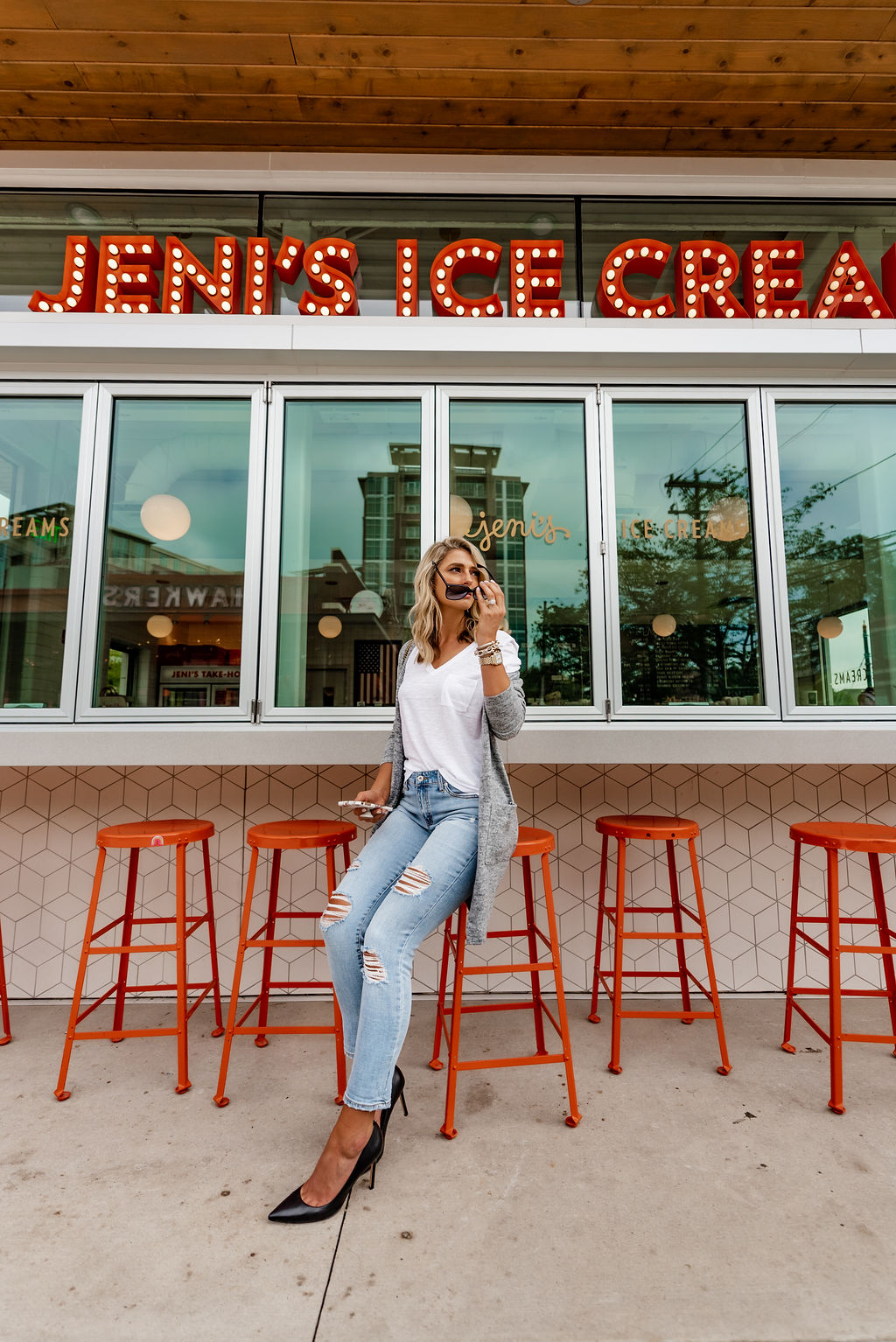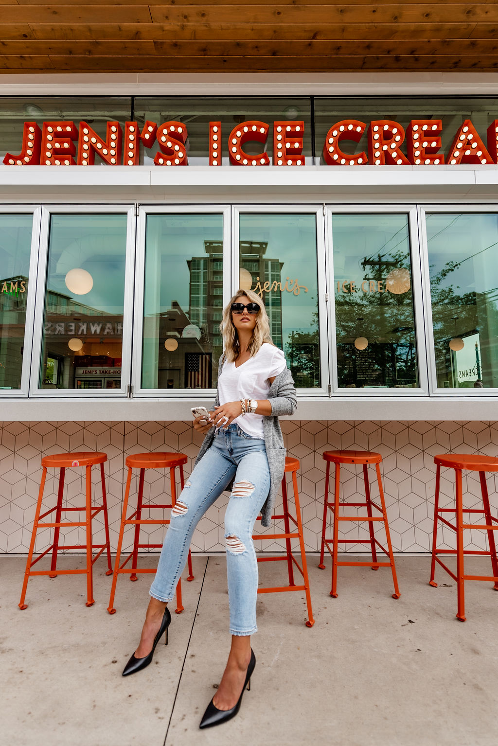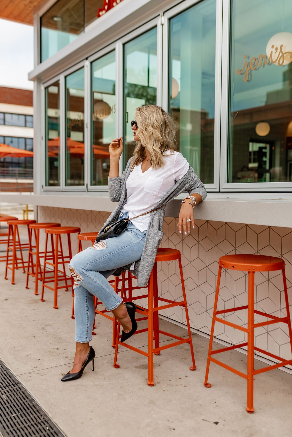 These are from Sofia Vergara’s collection with Walmart (which by the way, if you haven’t checked this collection out, you should), and come in at under $30! I am wearing a size 4 for reference, and they do run true to size. I have the hem of these jeans rolled down, but for a more casual look you can roll them up once. I paired them with a casual white t-shirt, and this duster cardigan from Sofia’s collection, which comes in 4 colors with 2-day delivery. It’s soft, super versatile, and looks great paired over a dress, or jean shorts as well.