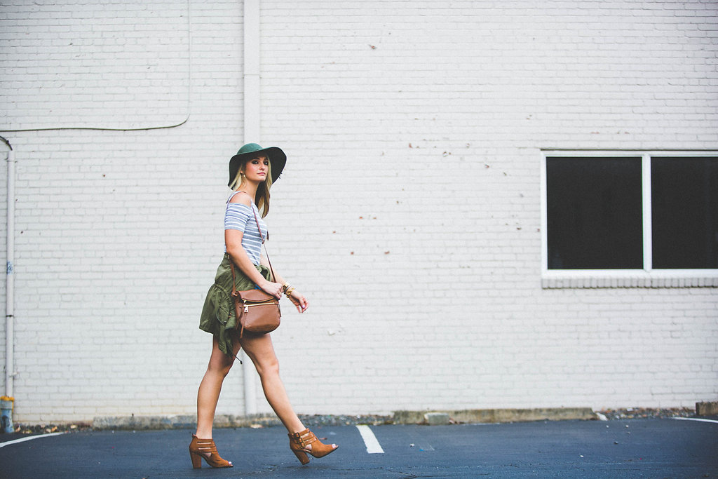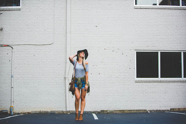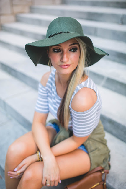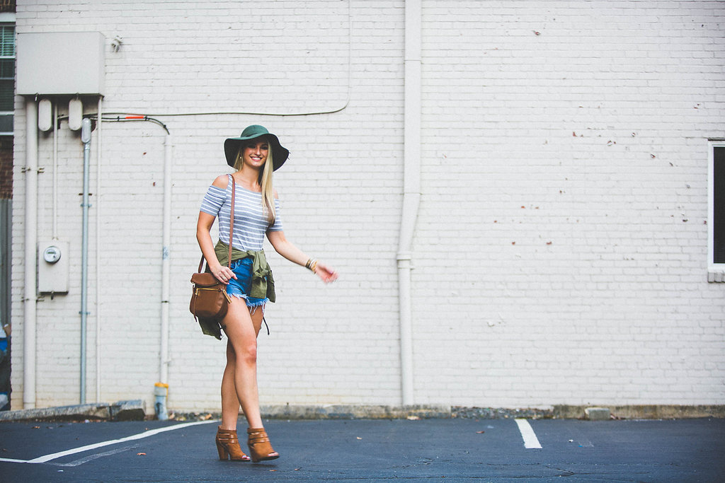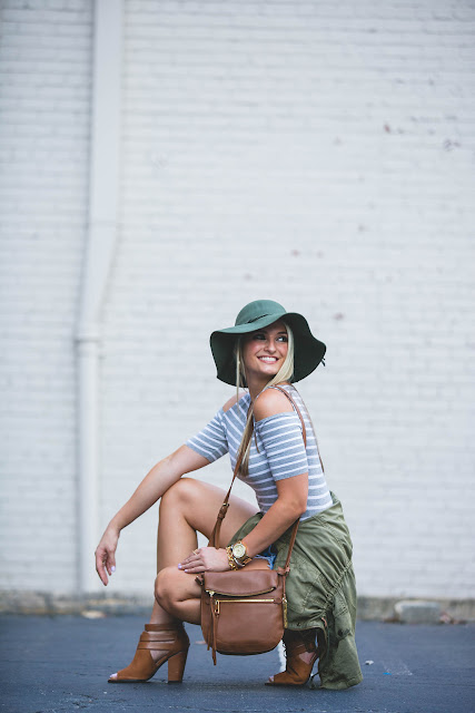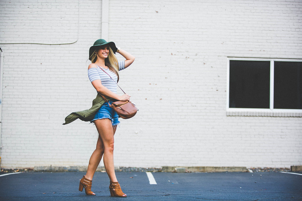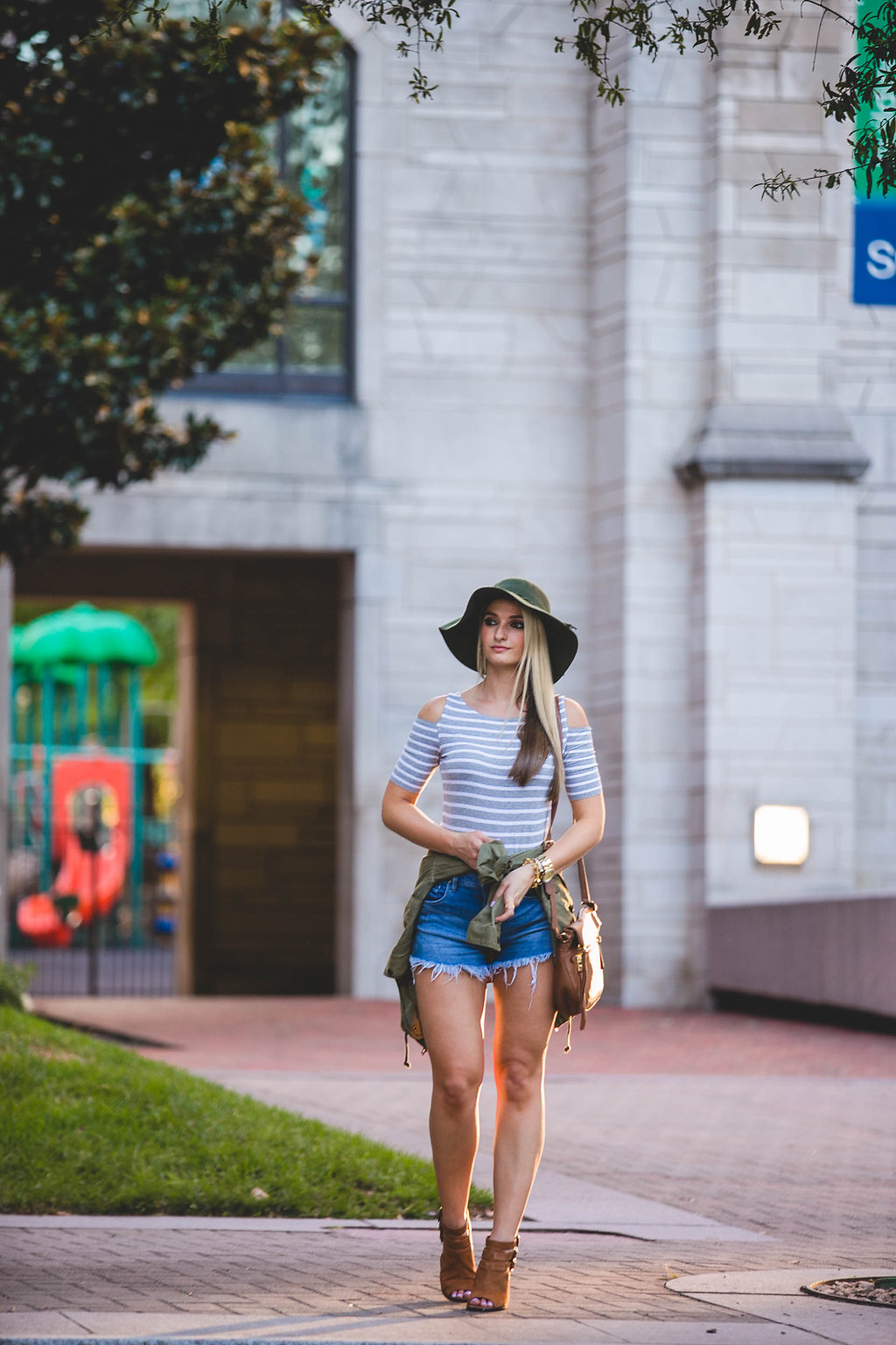 Bailey 44 Striped Top here and here // Jean Shorts // Military Jacket (sold out, similar here) // Booties (mine are last season, similar pair linked) // Crossbody bag