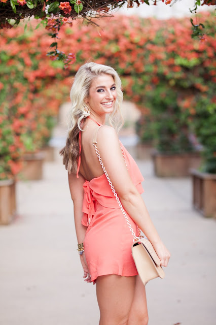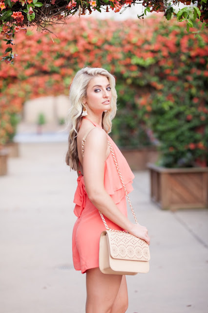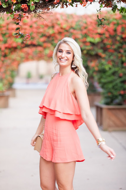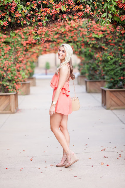 ASTR Halter Romper // Perforated Handbag // Vince Camuto Wedges // Earrings // Tassel Bracelet // Watch // Link Bracelet