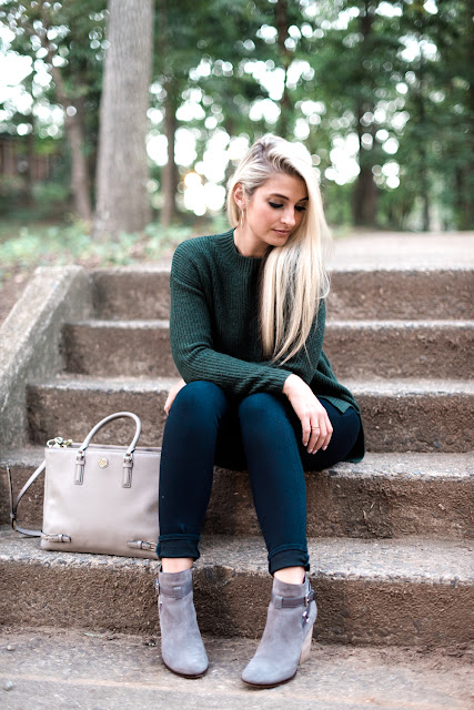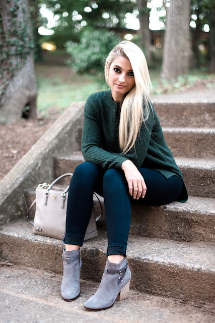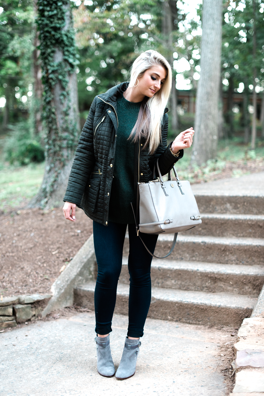 BP Ribbed Mock Neck Pullover // Quilted Jacket // Dark Wash Skinny Jeans // Grey Booties (similar here) // Handbag