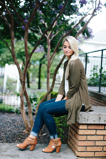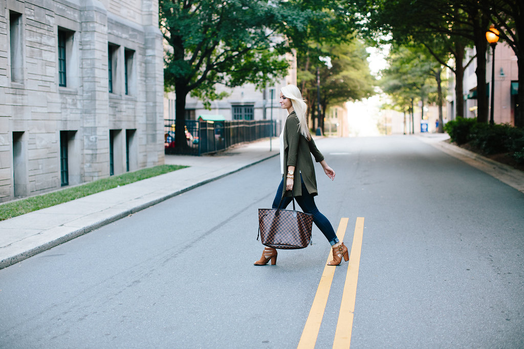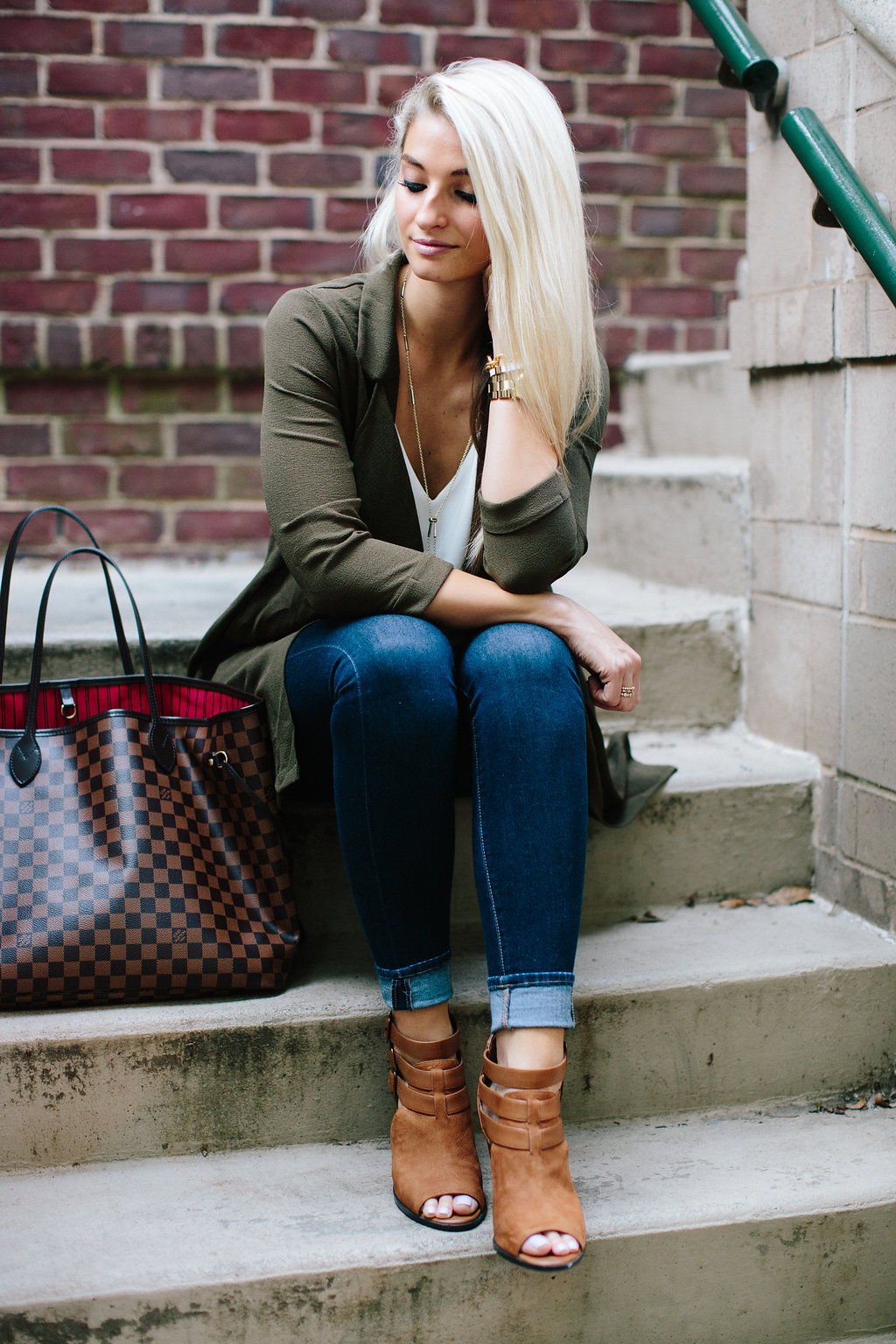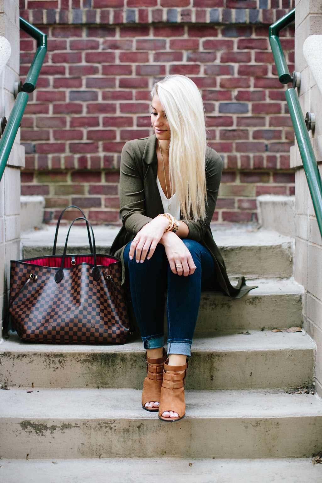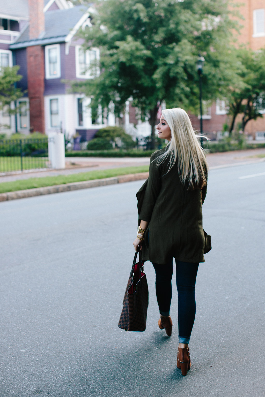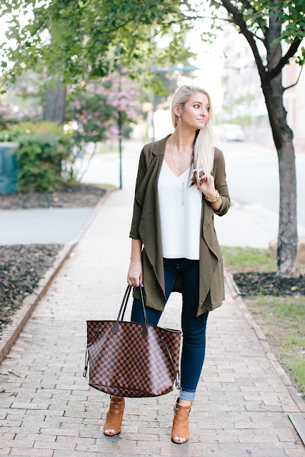 Olive Drape Long Jacket (sold out) similar HERE // Indigo Jeans // White blouse (have this in 4 colors) // Block Heel (mine are old) similar HERE, also love THESE // Hanbag Louis Vuitton Neverfull