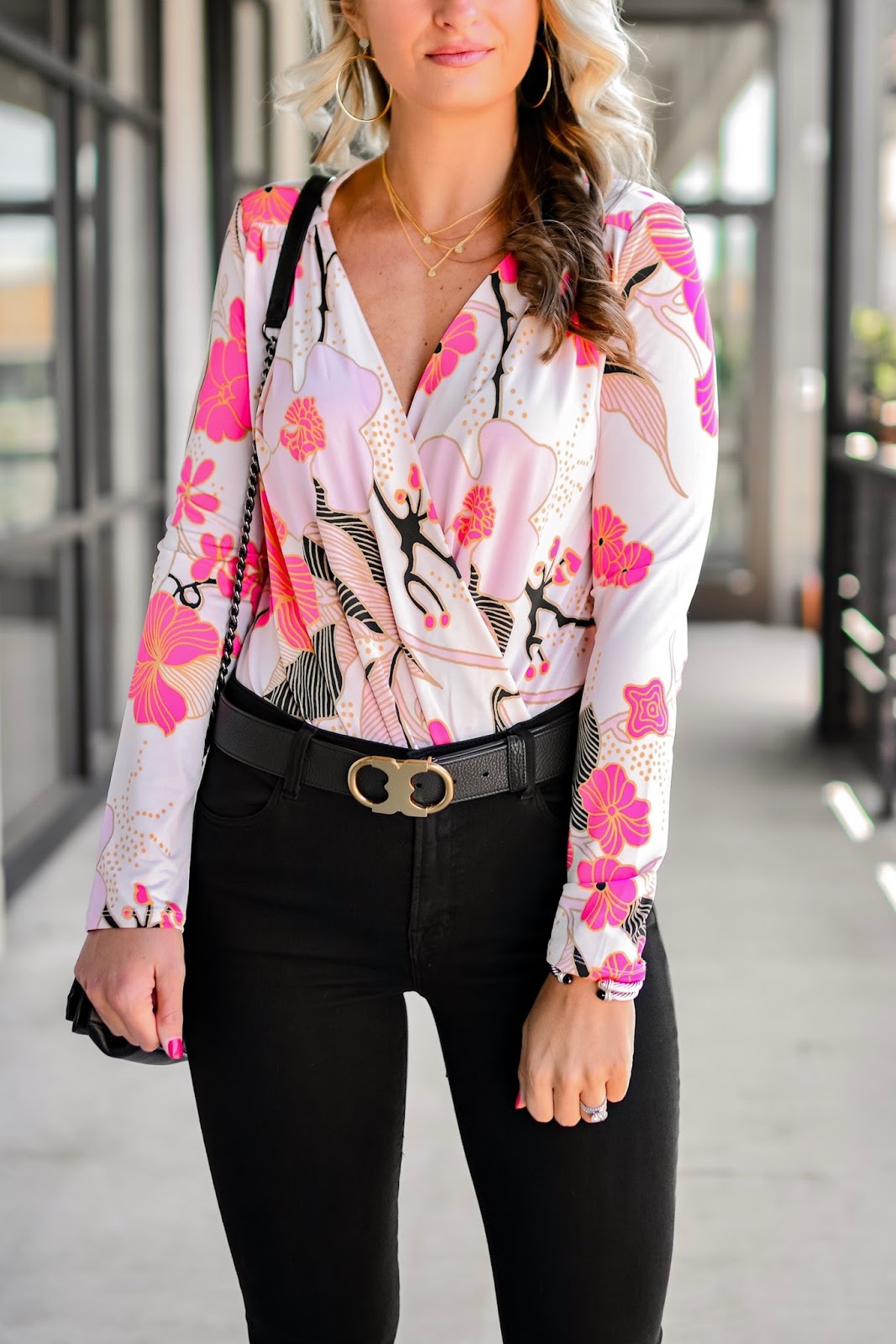 Now let’s talk about this little floral number! Anything bright and fun stands out to me in a store so I was immediately drawn to the print. So much so, that I also bought it in the kimono version and wore it over my swimsuit in the Dominican Republic. I’ve worn this outfit a few times now, and it’s perfect for going out to dinner in! It’s also really comfortable. The bodysuit is made up of stretchy material so it has a ton of give and breathes nicely because let’s be honest, once the drinks start flowing my body temperature tends to rise too, lol! The only thing better than the print, is the price – you really can’t beat a good top you can wear repeatedly for $60.