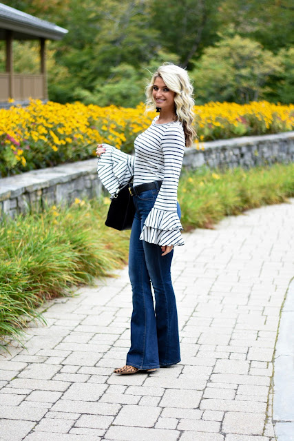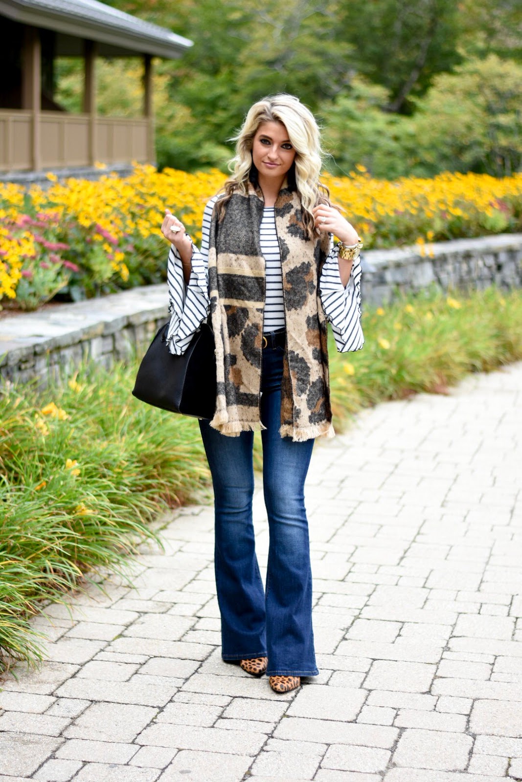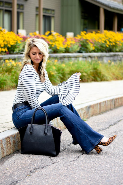 Free People Striped Tee // Vestique Flare Jeans (similar here)// Tory Burch Belt // Sole Society Handbag // Baublebar Earrings // Vince Camuto Block Heels // Leopard Pattern Scarf