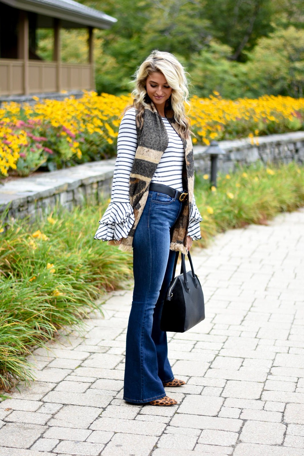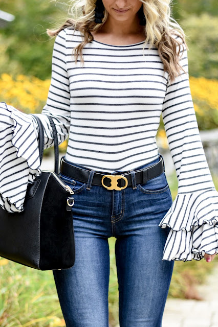 This top and these jeans are everything, ya’ll! I wore this outfit back in Vermont, and got a ton of compliments on it but the top sold out almost immediately so I’m just getting around to talking about it now that it’s been restocked! The top is super stretchy and tucks into jeans perfectly! The sleeves are what truly brings it to life for me, and it’s under $60. I’m also really excited that flare jeans are back. These are inexpensive and perfect to pair with pointed toe heels. My scarf is from last season, but due to it’s popularity and price point – it’s back again this year! Yay! During fashion week back in February, I was on the hunt for a belt that looked similar to the Gucci one everyone raves about but at a less expensive price point. Insert this one! It comes in two colors, and is half the price of it’s designer version. Yes, it’s still expensive but if you sign up for e-mails or purchase from the Tory Burch store – you can get $50 off around your birthday month! If you can’t wait that long, it’s an investment piece. A belt is somethig that’s never going to go out of style and can be worn with any outfit. Treat yourself!