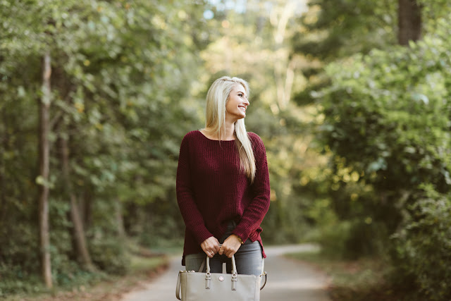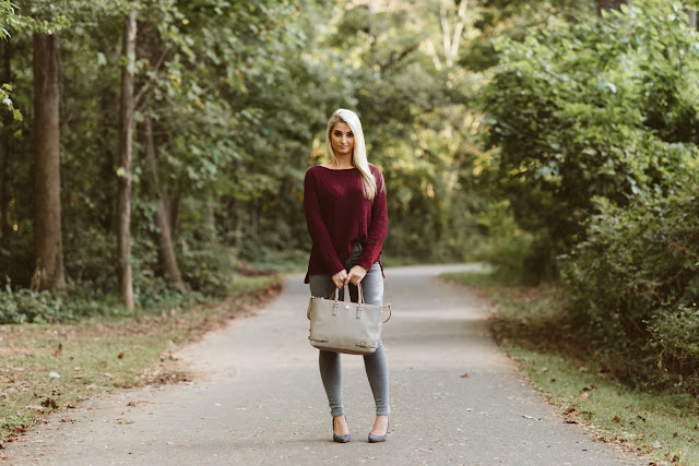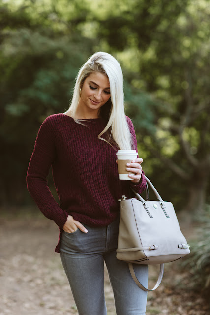 Being that I am a Clemson fan, I hate to admit this, but I love garnet. It’s such a beautiful color, and looks great on anyone! The second I saw this sweater I was drawn to it. The material almost feels like velvet on your skin, and I can’t even begin to describe how warm it is! Definitely perfect for fall temperatures if you don’t want to layer & it’s currently on saleThese jeans are also a favorite of mine, I had a little sticker shock with the price, but they’re also the softest jeans I own and unique in color. If you’re not looking to spend that much on jeans, try these or these as a dupe.