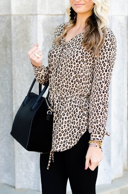 During Cyber Monday this year, I purchased these leggings and this top in every color offered. It’s important to me to feel comfortable and confident in my clothes at work and this outfit is just that. Combined with the fabric, the detailing these leggings offer down the front of the pant, takes these from casual to business appropriate. Generally speaking, leggings are not appropriate for the office. So I was super excited to find a pair that were! They’re so comfortable that when I get home from work, I’m not running up the stairs the second I walk in the door to change out of them, which is a major win in my book. I paired them with a feminine blouse which you can find here, and as the temperatures drop it’s the perfect piece to add a trench or shawl collar coat too!
