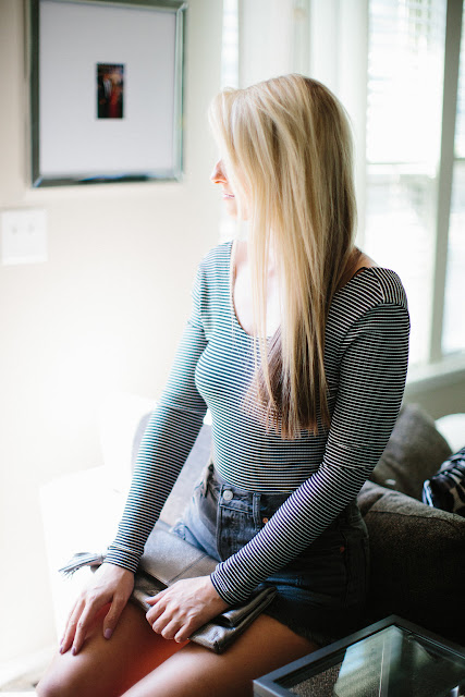 Topshop Striped Body Suit // Levi’s Shorts // Foldover Clutch // Gorjana Earrings // Sam Edelman Yardley Block Heels