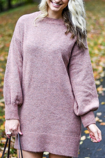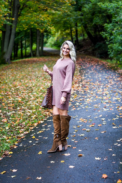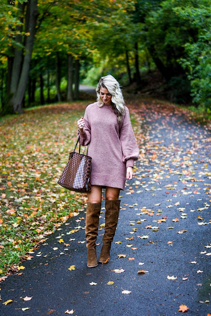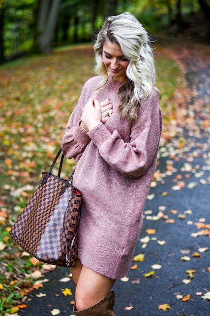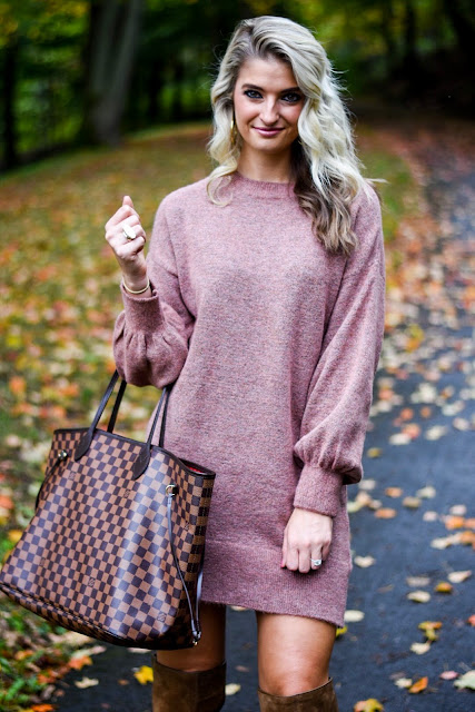 Mauve Sweater Dress // OTK boots (mine are last seasons, linked similar) // Louis Vuitton Neverfull // Cocktail Ring // Earrings
