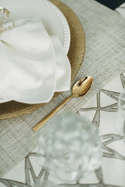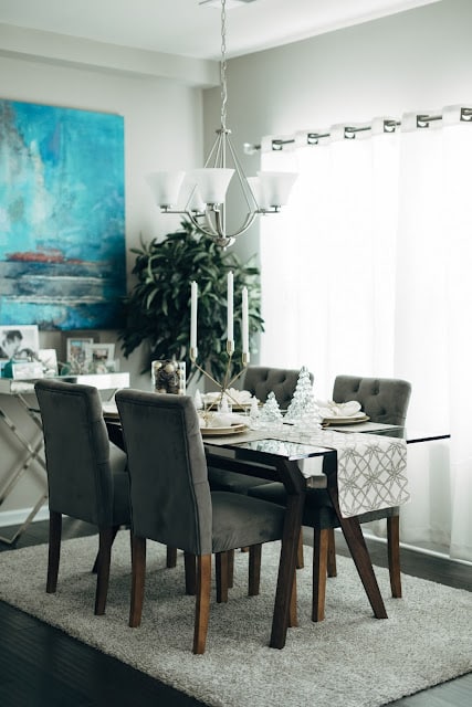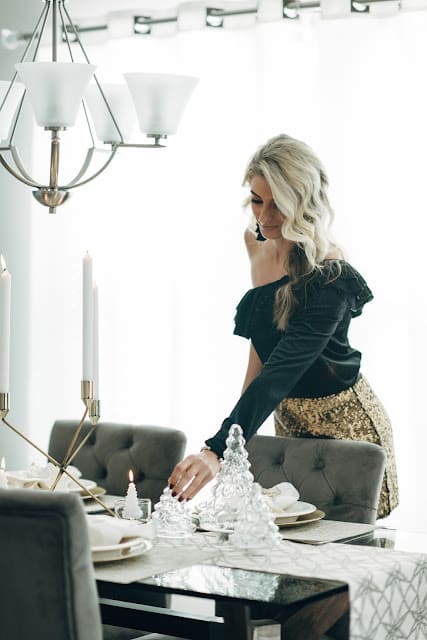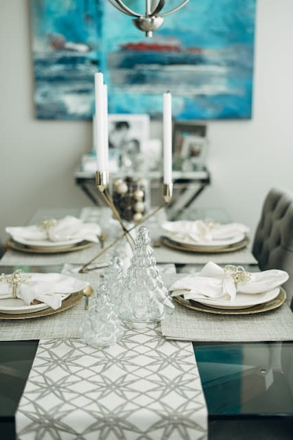Nonetheless, my table is set and I couldn’t wait to share it with you! I’m really happy with how it turned out, and think it’s timeless for reuse in years to come. Most of our home is monochromatic with neutrals – so I wanted a warm tone color scheme that fit within that category (ie. glass, chromes, and metallics). I know I’m a little late writing this, but what’s great about that is that most of these items are now on killer sale! So, if you wanted to recreate the look for next year – you can save big time by buying it now (the best time to buy holiday decorations is always directly after the holidays). If you’re interested in seeing the rest of our Christmas decor, see this post.