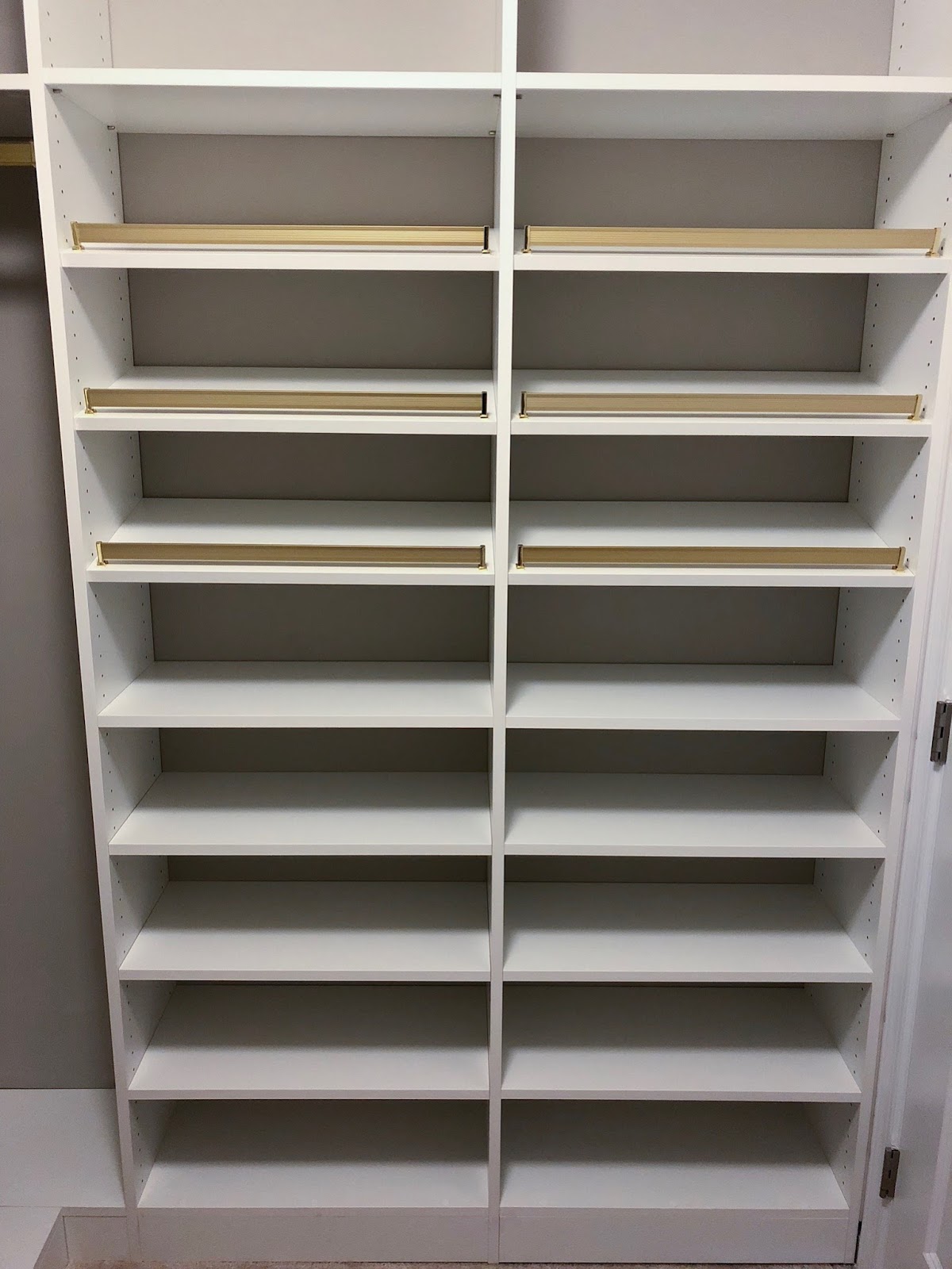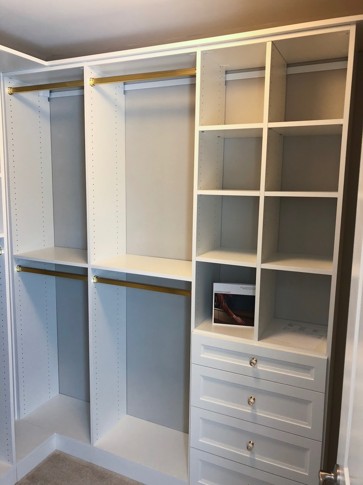 Once we nailed down the actual design, I met her at their showroom to pick out hardware and finishes. It was so helpful to be able to see all the options on an already finished design in the showroom! I knew I wanted a white closet (our walls are Benjamin Moore Revere Pewter, so white provides a beautiful contrast), and gold hardware – but the knobs for the drawers were my favorite final touch!