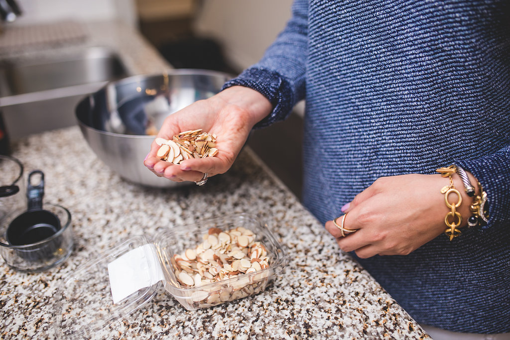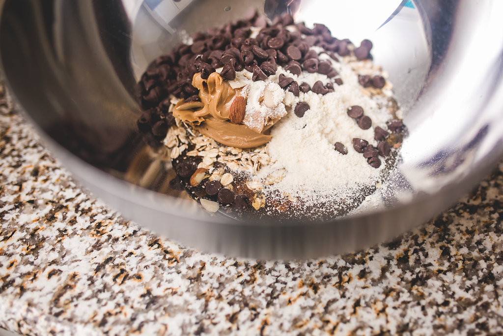In a large bowl, mix rolled oats, almond meal, protein powder, almonds, chia seeds, and flax seed together. In the same bowl, add in peanut butter, honey, coconut oil and chocolate chips. Mix all ingredients together until you get a thick sticky/doughy substance. Put the mixed ingredients in the fridge for 30-45 minutes to allow mixture to harden (this helps when shaping them into a ball). Take them out of the refrigerator, roll teaspoon sized balls, and you’re all set!
