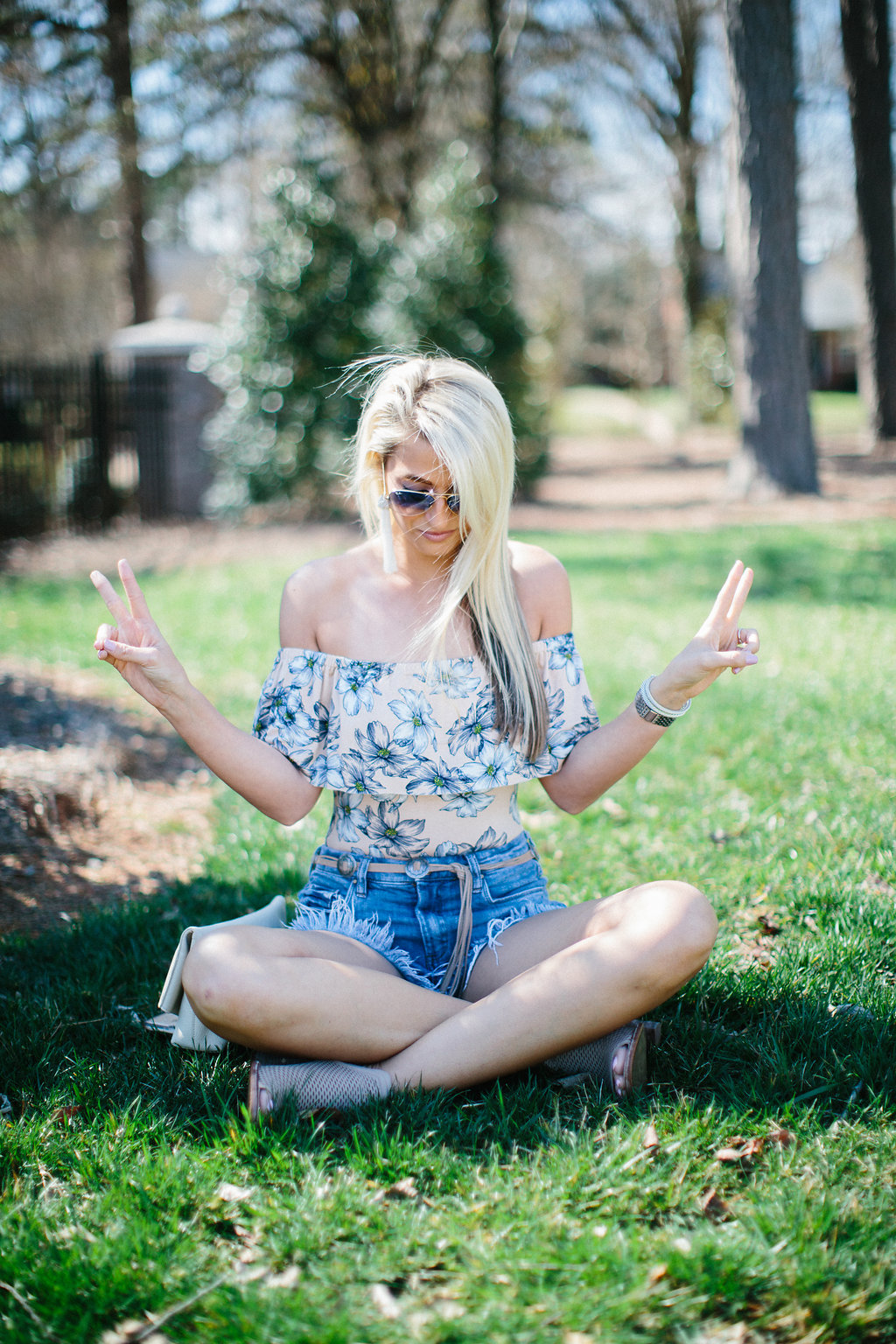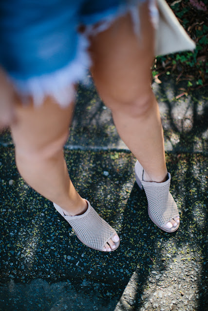 Clayton OTS top // BLANKNYC Denim Shorts // Lovers & Friends Belt // Vince Camuto Booties // Aviator Sunglasses // Tassel Earrings // Gigi New York Clutch