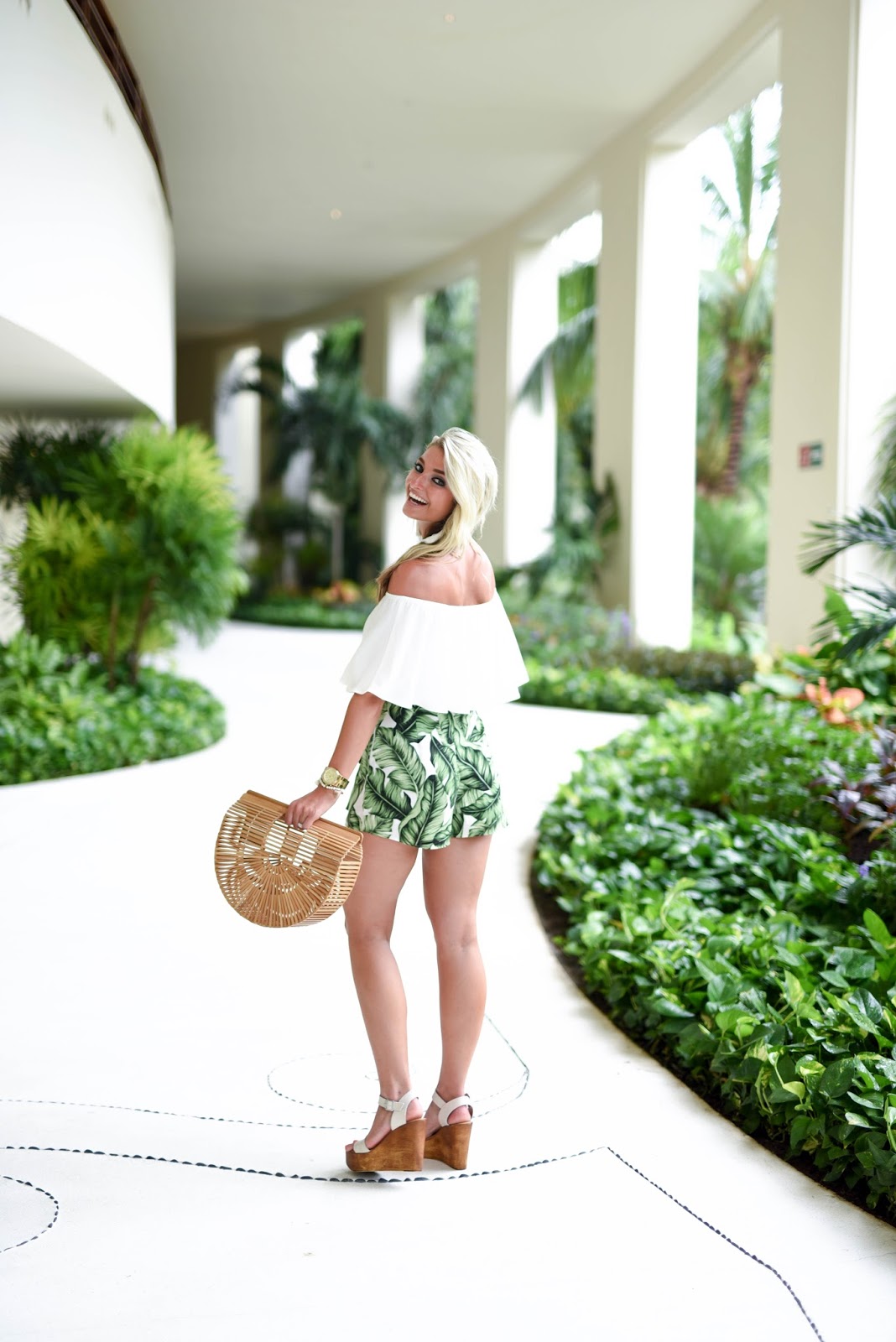 Anyway, palm print is definitely one of the most popular trends this summer. I’m also really excited that skorts are back! There’s no better feeling than looking like you’re rocking a skirt, but moving around like you’re in shorts! Best of both worlds. Am I right? These fit true to size, and I’m wearing a small in both the top and bottoms. I consider my top a staple item this year! Traditionally, I wouldn’t categorize something off the shoulder as a staple, but I’ve worn it so many different ways that I decided it was versatile enough for that classification. My bag is the designer brand, however, I found an exact dupe for under $70 that’s just as swoon worthy!