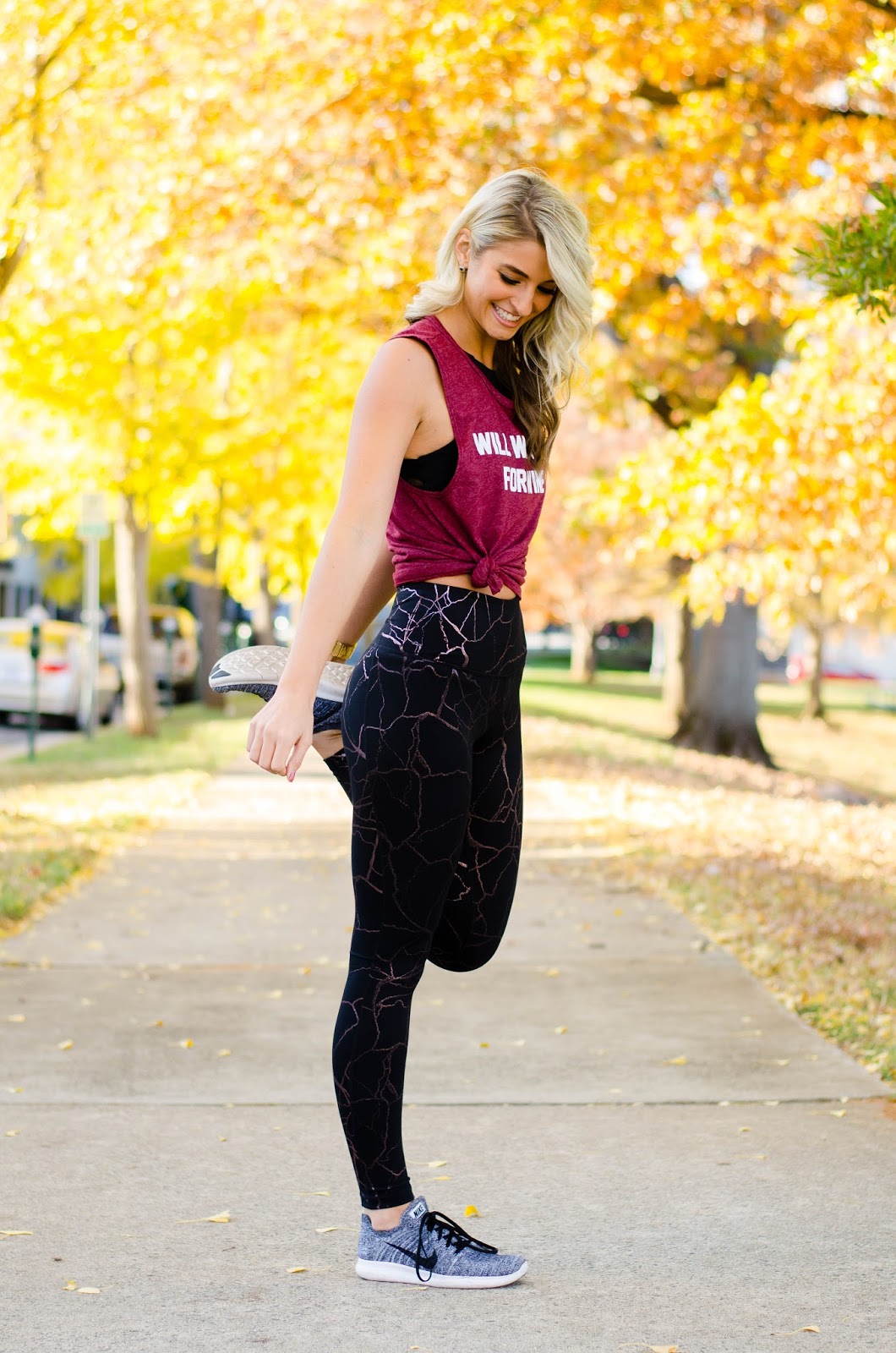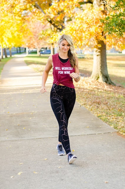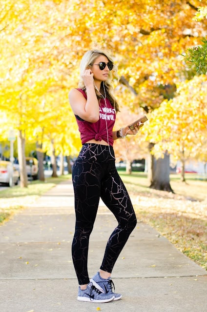 Cheers to all who are still reading! Now that I’ve rambled and gotten off my virtual soapbox – let’s talk about the outfit for a minute. How fun are these leggings?! I have them in a bunch of solid colors, but thought these were so cool! This is random, but they keep reminding me of Bill Nye the Science Guy – LOL. I have two of the solid black ones because they also double as my leggings with oversized sweaters, thermals, and puffer vests and I like that they are reasonably priced. I sized up in this top for a baggier fit so I could knot the bottom of it, so I’m wearing a medium. Even if you aren’t planning on wearing it to the gym, it makes a cute athleisure outfit with a zip up jacket thrown over it!