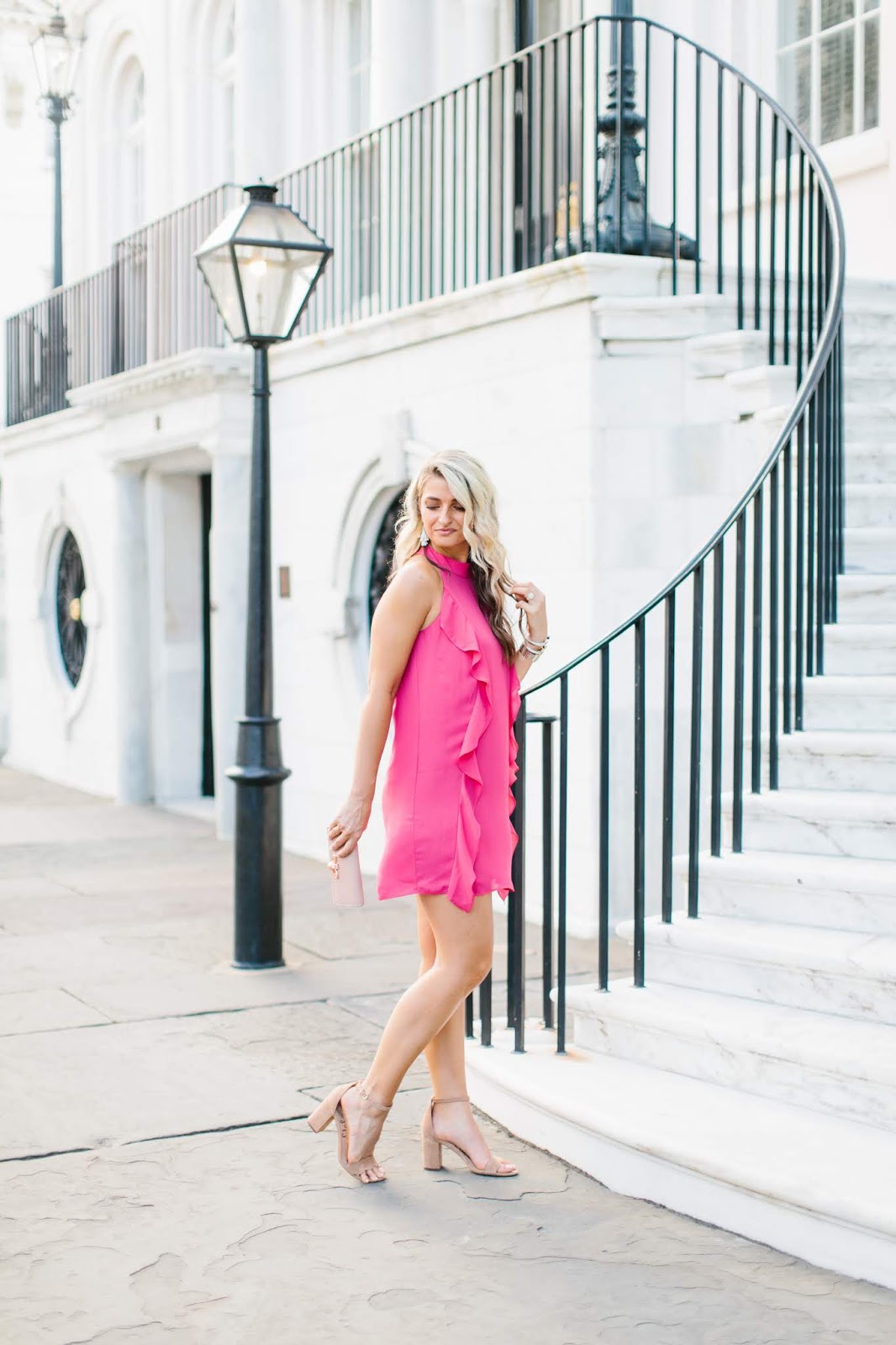 I’ve never met a shade of pink I didn’t love! Funny story, I love all things bright and colorful. If you’ve been following me for awhile now, that probably comes as no surprise. But my mom on the other hand, loves all things black and white! I’m not kidding when I say her entire closet is black and white. Interesting how that works out, huh? Anyway, I wore this dress to a rehearsal dinner for a girlfriend of mine in Charleston recently! If I had not have been in the wedding, I would have opted to wear it as a “guest of the wedding” dress because it’s perfect for that! I love it’s simplicity, classiness, and the subtle ruffle detailing that makes it feminine yet flirty. Plus, this neckline is always flattering no matter who you are! I’ve never seen it look bad on anyone.
