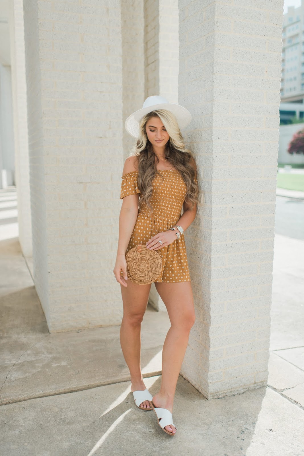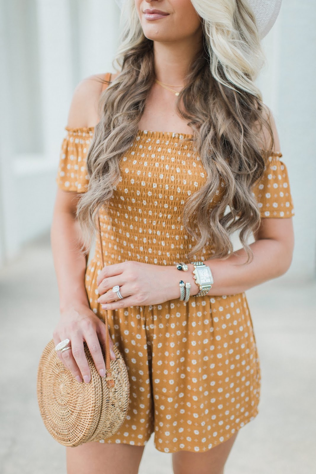 Happy Friday, girls! I hope this week has treated you well. This romper is currently on sale for under $27 and selling out in popular sizes quickly! I wore it a few weekends ago, and haven’t had time to share it with you yet but I’m obsessed. It’s super lightweight and comfortable for the 90+ degree days we have here in the Carolina’s. It’s what I like to call “airy”, haha. If you’re not a fan of off the shoulder numbers, or worried about it falling down – the top of it is smocked, which helps keep it in place while moving. I didn’t have an issue with it at all! The Marigold color is also perfect for transitioning into fall. I’m usually not ready to transition to fall content until the end of August, but with all the rain and cute sweaters/cardigans appearing in stores, I’m looking forward to crisp mornings, apple cider mills, football (college that is, my husband drives me crazy with the NFL), and all the boots and booties!