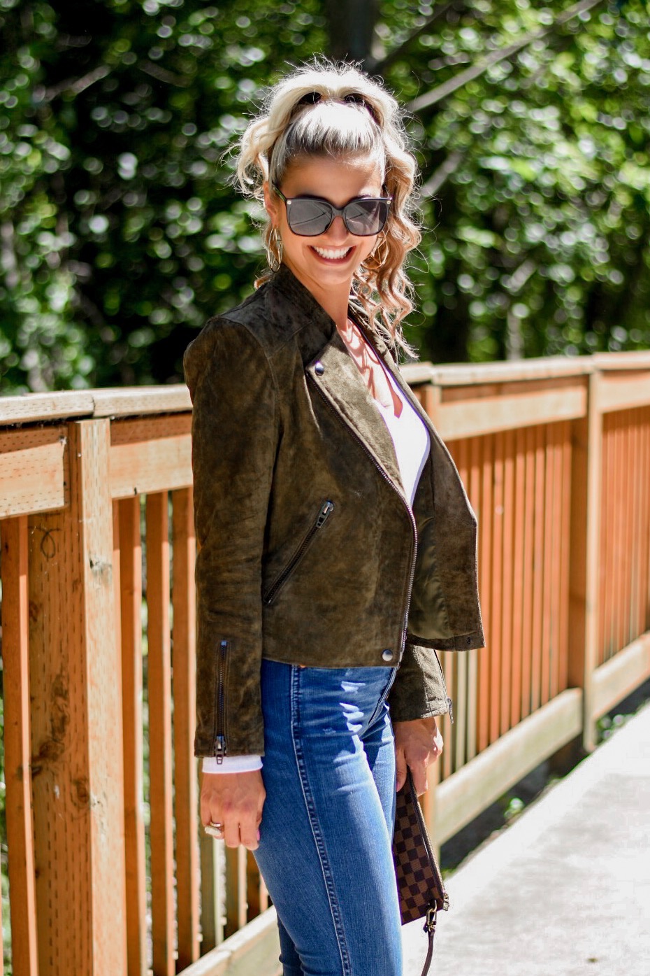 Suede Moto Jacket // High-Waist Skinny Jeans // Suede Booties // Ribbed V-Neck Tee // Sunglasses // Earrings