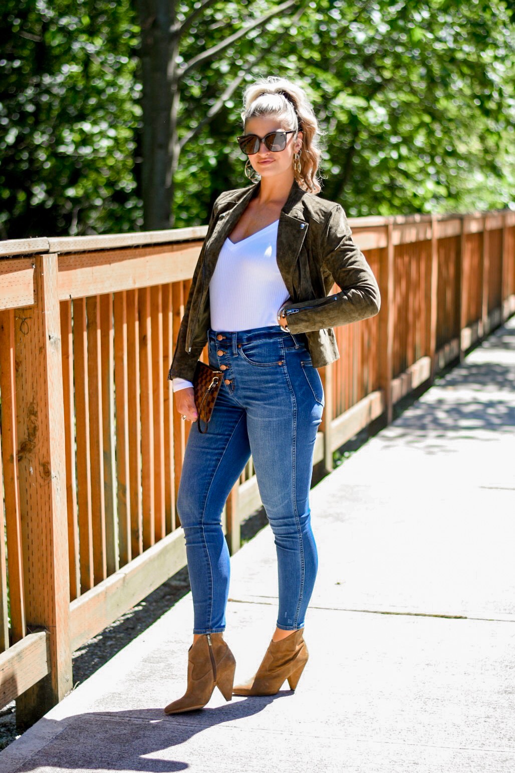 Happy Monday from Seattle! I’m excited to share one of my favorite finds for fall from the Nordstrom Sale this year. This is my third year covering the Nordstrom Anniversary Sale, and despite the tech hiccups, I found some really great deals on items that are perfect for the upcoming fall season. I’m such a summer person, that sometimes it’s hard for me to shift gears in July and start thinking layers, muted tones, and suede – but, this look is classic and one I repeat all fall long. All of the items in this outfit are what I would consider “wardrobe staples.” The ribbed tee can be paired under a cardigan, oversized scarf, jacket, or by itself, and goes with everything due to it’s neutral color. This was my first time buying Madewell jeans, and I don’t know why I waited so long because I’m in love! They are a 10″ high rise so they come up right to my belly button which I like. They do run a little big though, so I recommend sizing down one size. I also really like the rust colored buttons, it’s a nice compliment for fall and looks cute paired with the short waisted jacket. I’ve owned moto jackets of all versions for years now, and don’t plan on stopping anytime soon! They’re warm but not too bulky, good quality so they hold up perfectly over time, and the cropped cut is flattering in terms of elongating your legs. This is my third color, and I’m loving the olive! Booties are something I never have enough of, I’m always trying to pair the color of my top with the same color bootie (guess it’s the OCD in me), so adding to the collection can never hurt. Most of what I already own are round toed, so these were a nice change and I love the color!