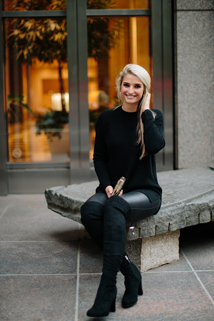 I love this look! All black is classic, and you can’t go wrong with leggings and an oversized sweater this time of year. I actually liked this sweater so much, I went and got it in two different colors. It’s only $39 and great quality, so it’s something I can wear for seasons to come. These are also my favorite leggings! They’re a little pricey, but they’re made by SPANX so they smooth everything out nicely, and they are great quality. Not to mention, the faux leather look can easily be dressed up or down!