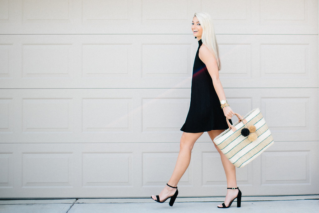 Clayton LBD // Carrson Sandals // Mar Y Sol Woven Bag // Gorjana Earrings // Michael Kors Watch // Julie Vos Link Bracelet // MAC lipstick in Blankety mixed with BareMinerals Mavelous Moxie in Trailblazer // MAC lip pencil in Spice