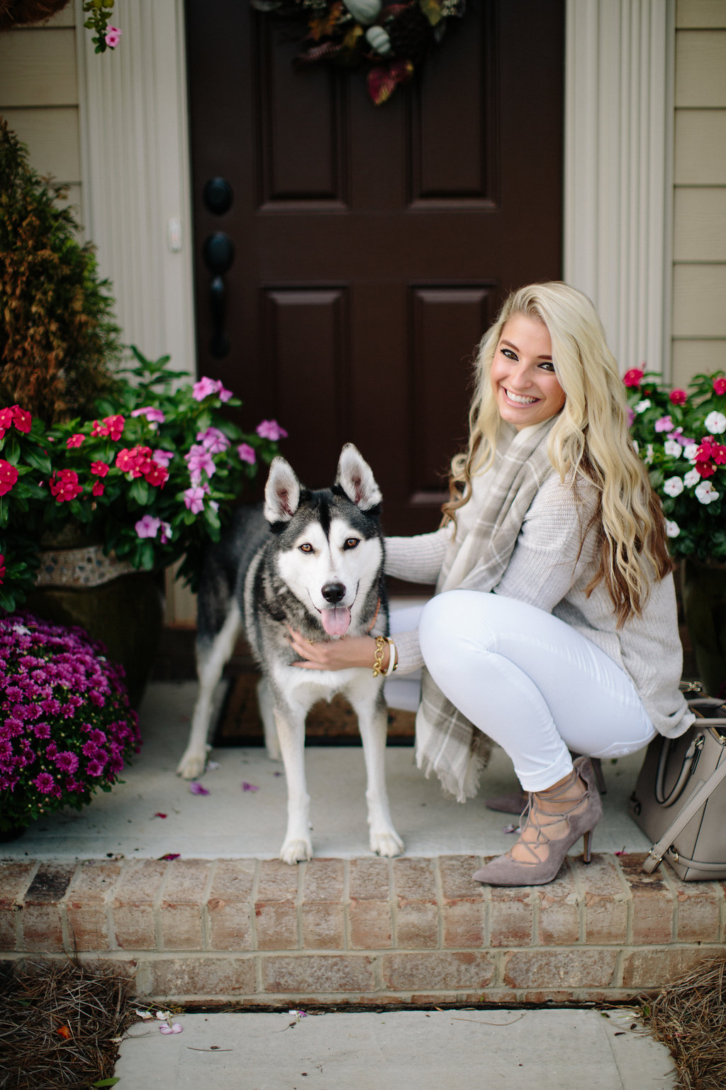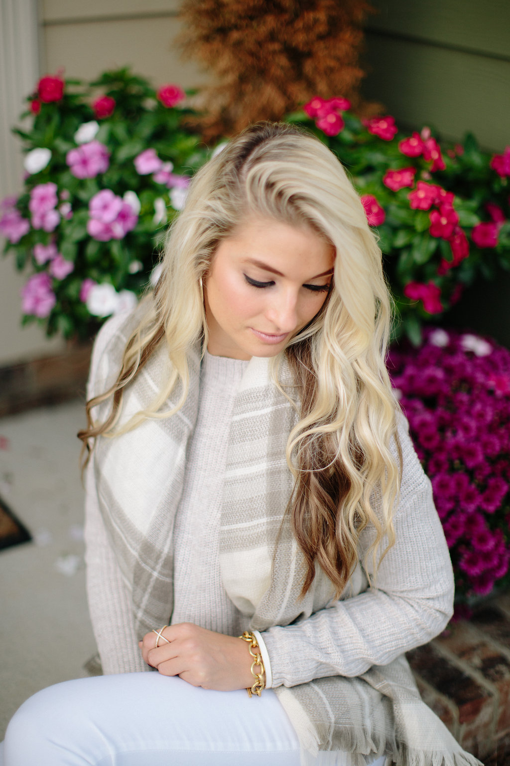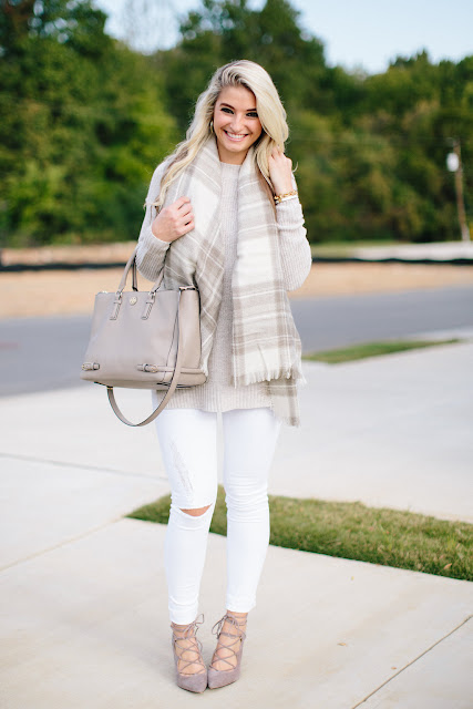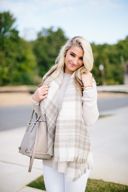 Tis the season for blanket scarves and oversized sweaters my friends, and I just can’t get enough! This neutral duo is a showstopper, I mean have you ever seen a scarf and sweater match so perfectly?! If you’ve been following along, you’ve probably noticed I have this mock neck sweater in multiple colors (see this post), because why not? It’s at the perfect price point, it’s versatile, and great quality. I paired it with white jeans for this outfit (I obviously don’t follow the rules), which really helped play up the neutral tones for a crisp look. These Vince Camuto pumps are still a fav of mine, and super comfortable! I wear them to work regularly, and they don’t bother my feet at all – highly reccommend.