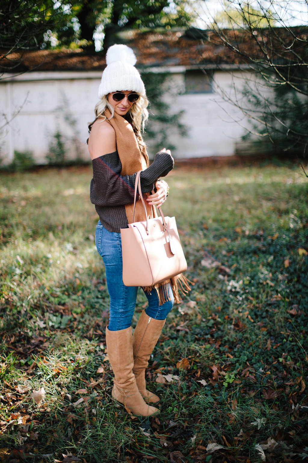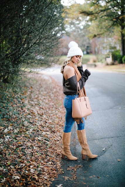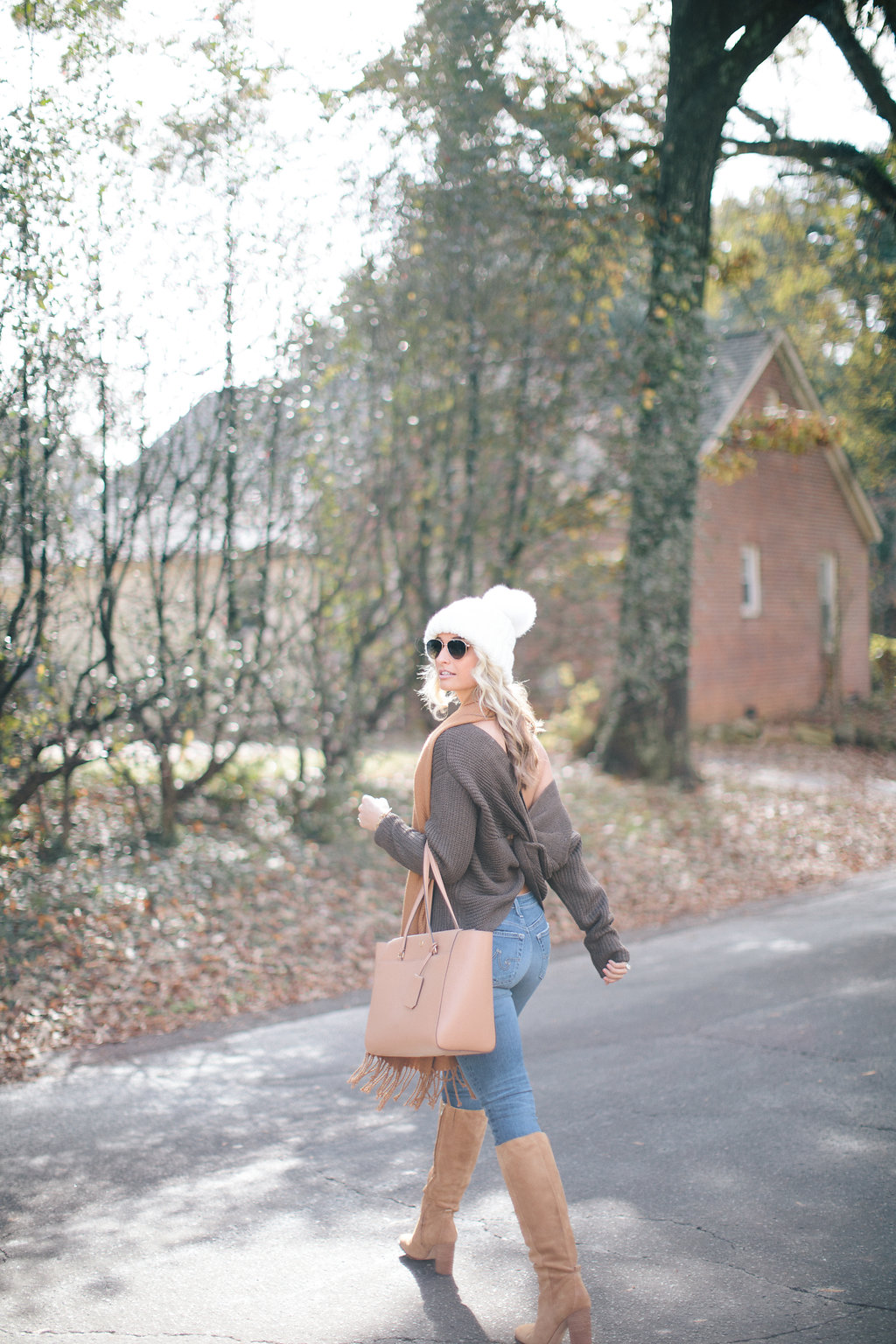 Twist Back Sweater // Jeans // Knee High Boots // Scarf // Cable Knit Beanie // Sunglasses // Tote // Link Bracelet // Cocktail Ring // Earrings // Watch