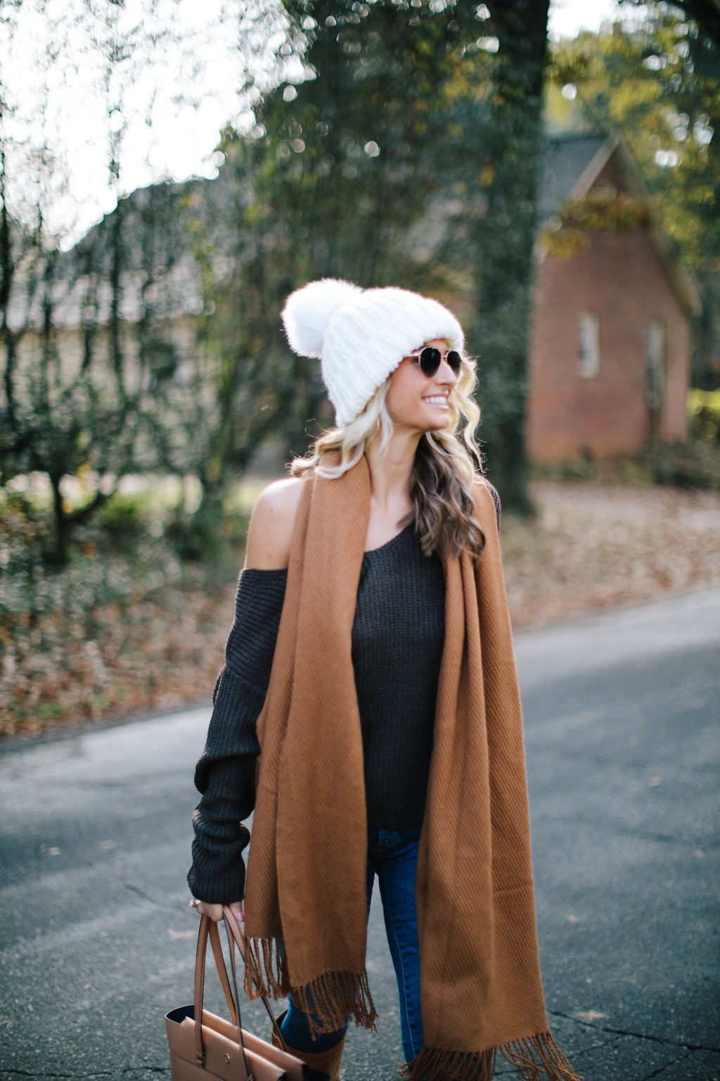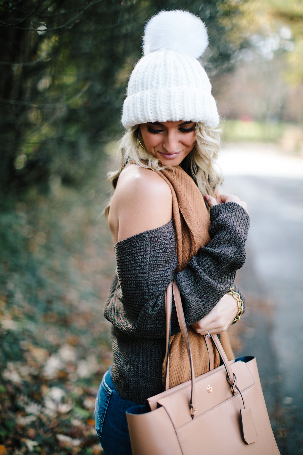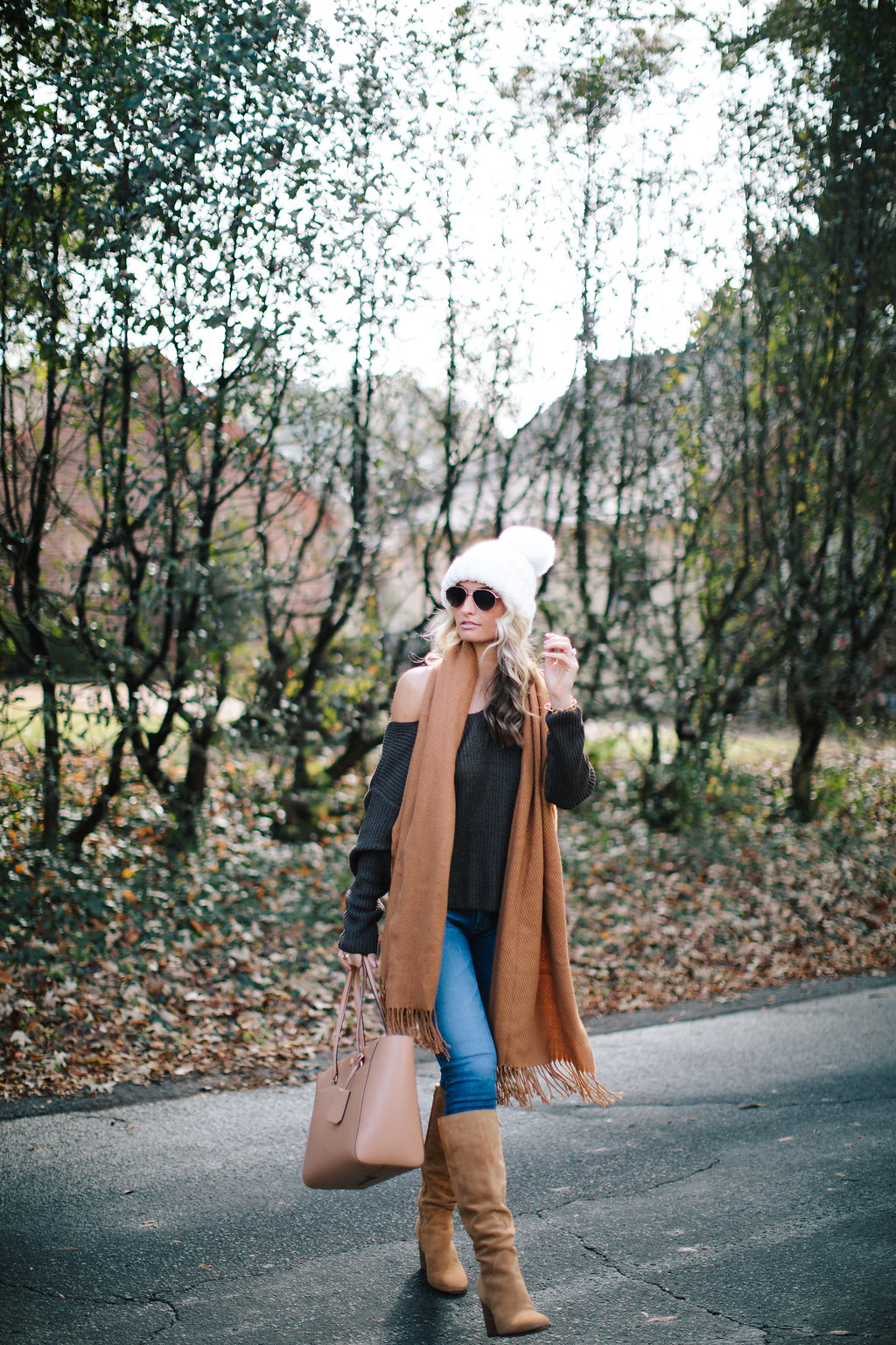 Twist Back Sweater // Jeans // Knee High Boots // Scarf // Cable Knit Beanie // Sunglasses // Tote // Link Bracelet // Cocktail Ring // Earrings // Watch